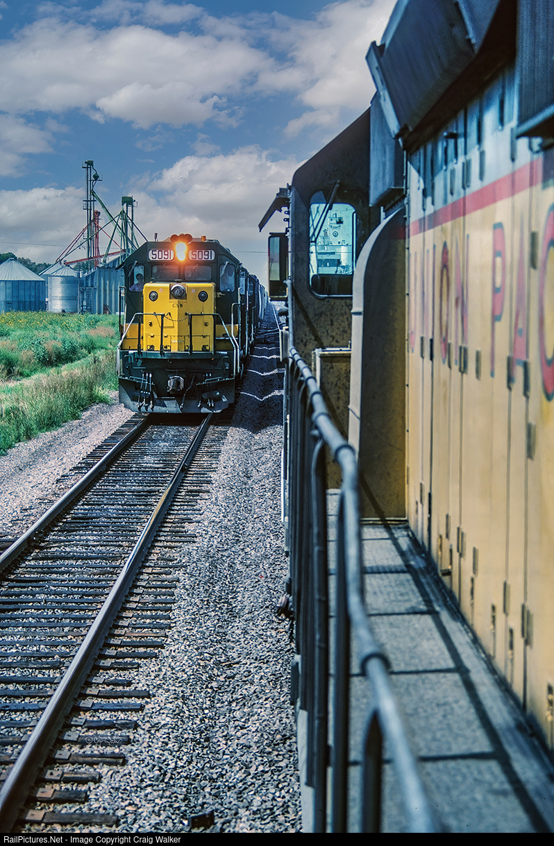 A westbound Union Pacific freight, led by UP SD40-2 3376, waits as it meets an eastbound Union Pacific freight with Chicago & North Western GP50 5091 on the headend, on UP’s busy Kearney Sub. (Gothenburg, Nebraska – August 20, 1987)