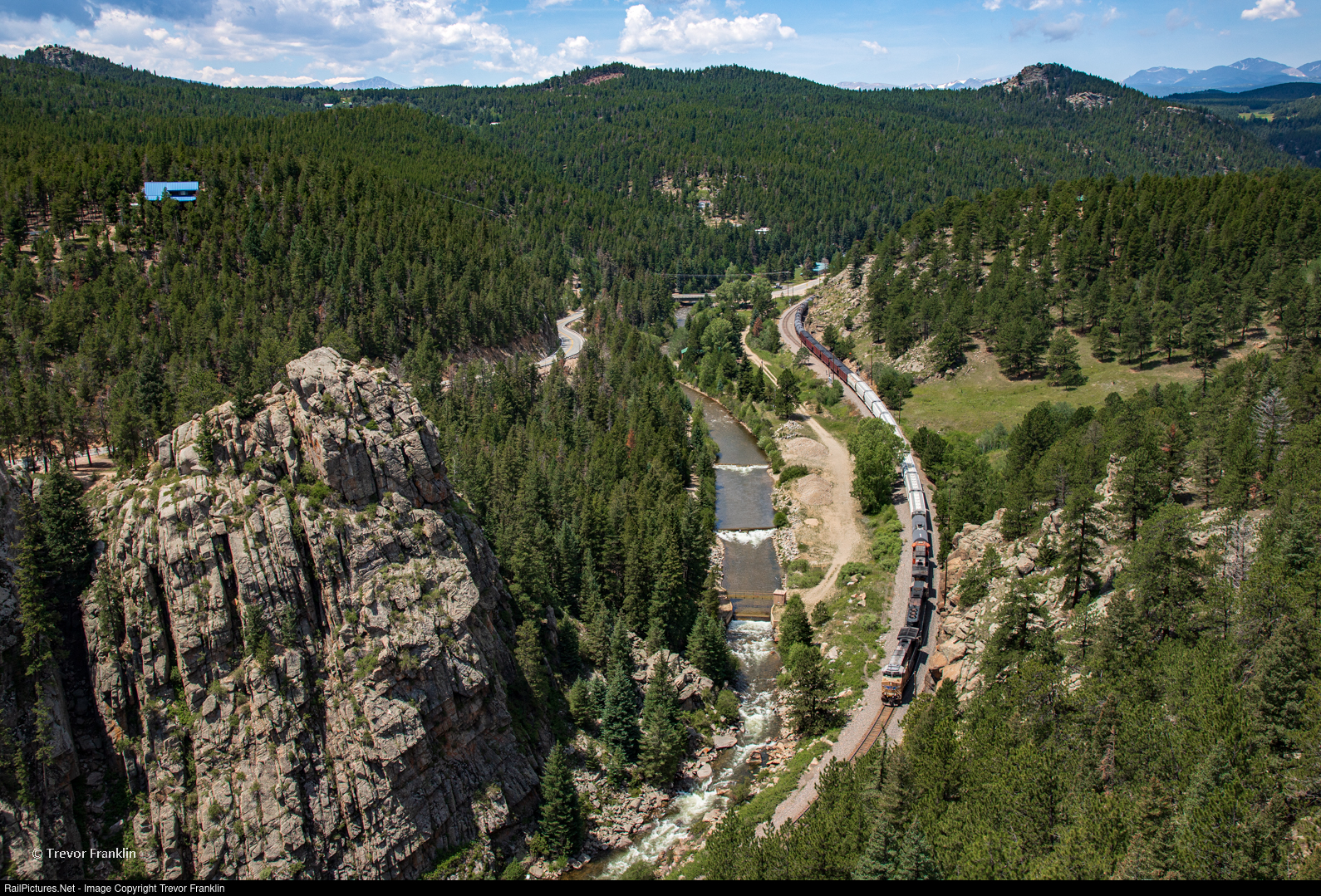 Nestled at just over 8000', the town of Pinecliffe, named in the most literal sense, hosts an eastbound manifest following the rushing waters of South Boulder Creek on its descent towards Denver on the former D&RGW. Although far from soft lighting, the high mid-day sun reveals the cuts and crevices of the massive granite formations carved along the river.