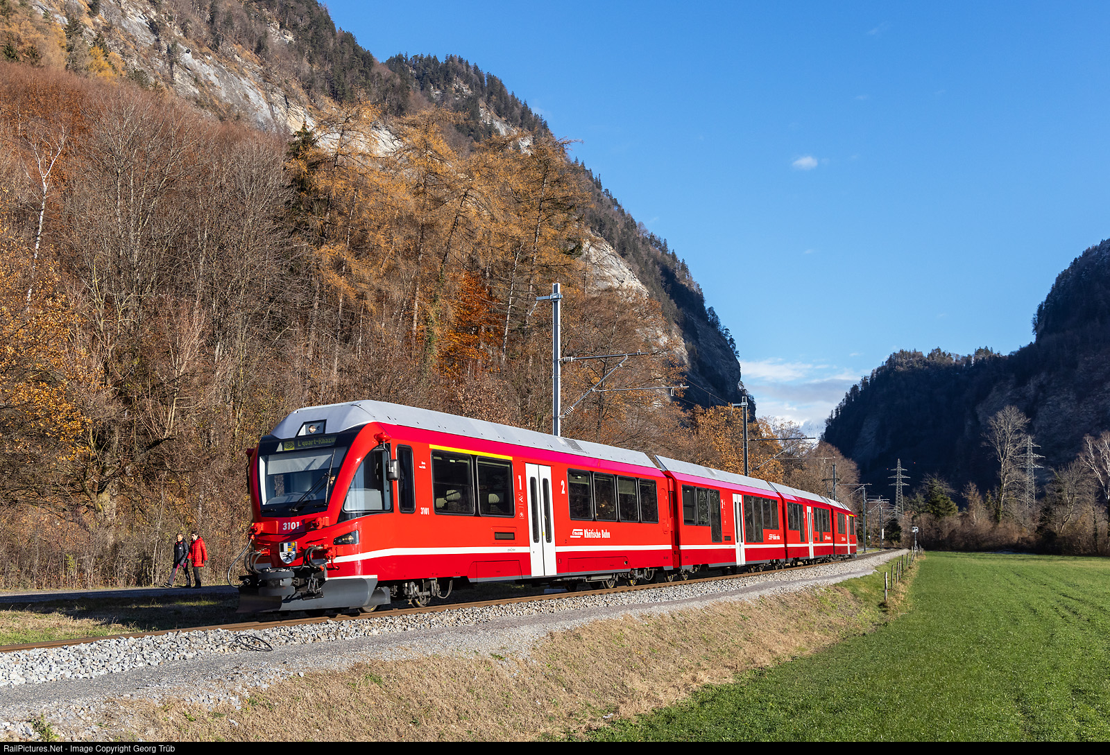 | "STZ" (Stammnetztriebzug/EMU for the main network) ABe 4/16 # 3101 is running the S 1 service 1517 from Schiers to Rhäzüns, between Grüsch and Malans. |