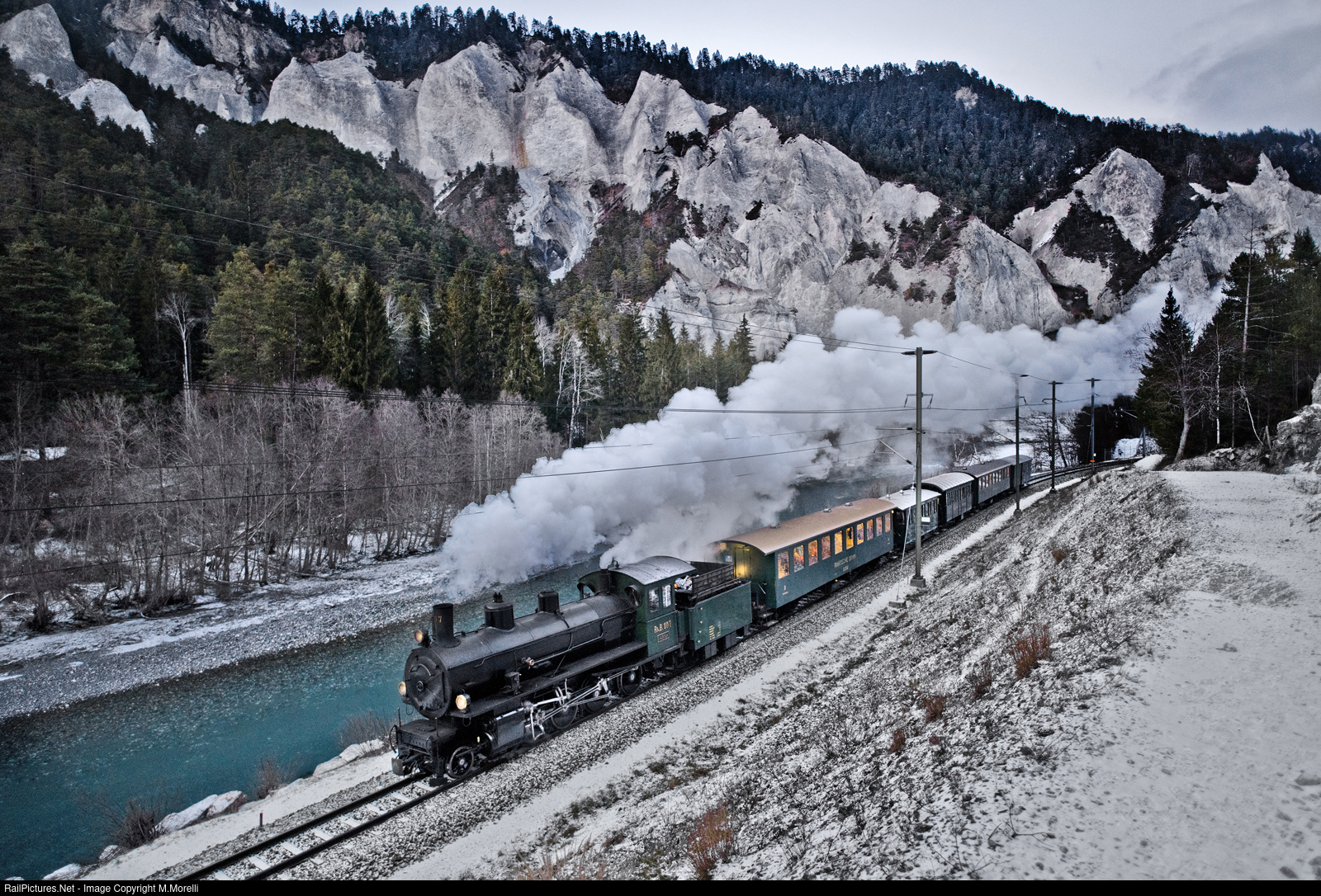 The Steam locomotive G 4/5 Nr.107 Albula takes inthe twilight the Cla Ferovia train to Lichterland.