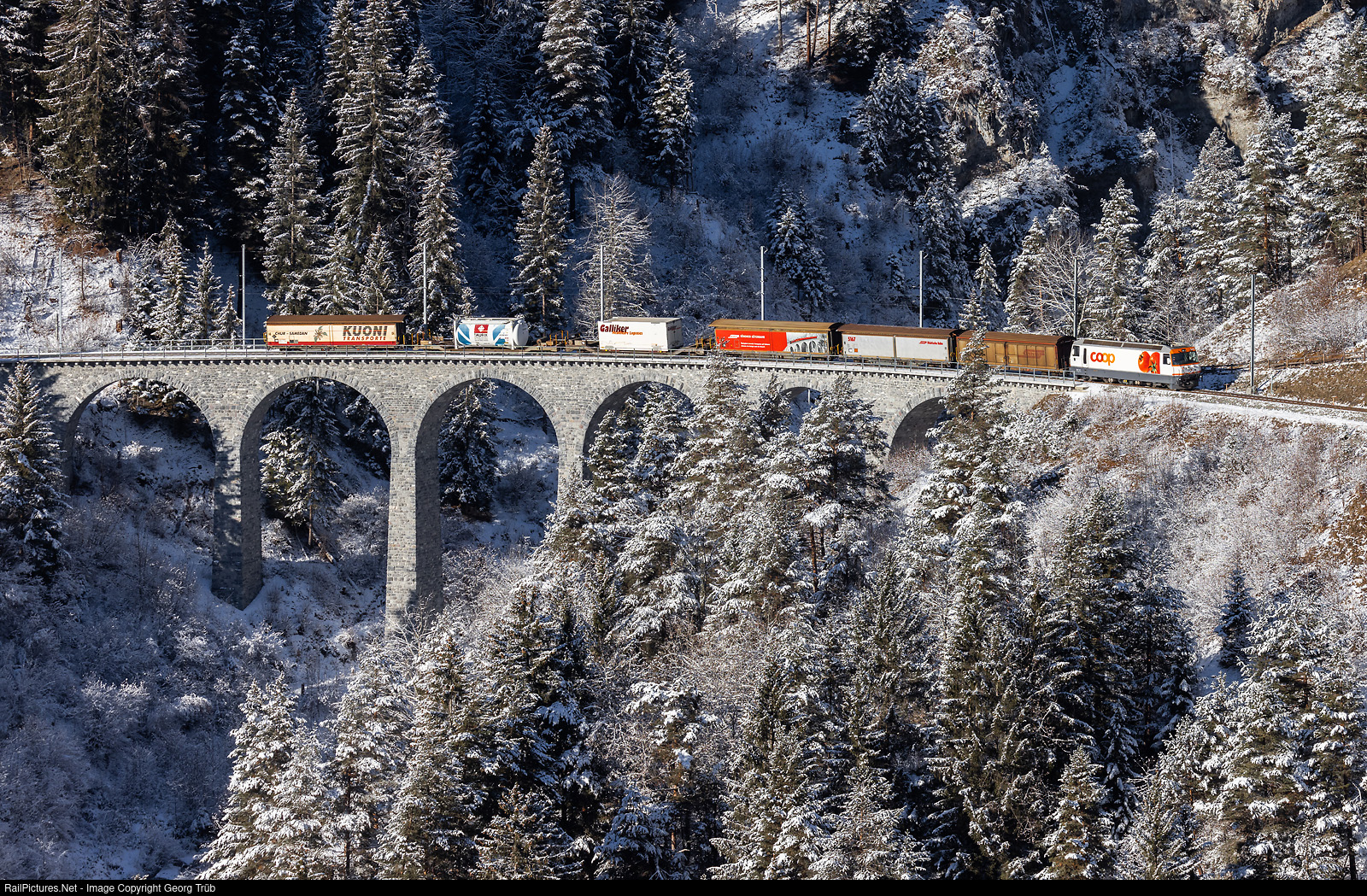 | Ge 4/4 III # 641 of the Rhaetian Railway in the Coop (retailer) paint scheme is pulling the freight train 5129 from Chur Freight yard over the Albula line to Samedan, crossing the 35 meter high and 137 meter long Schmittentobel viaduct between Alvaneu and Filisur. |