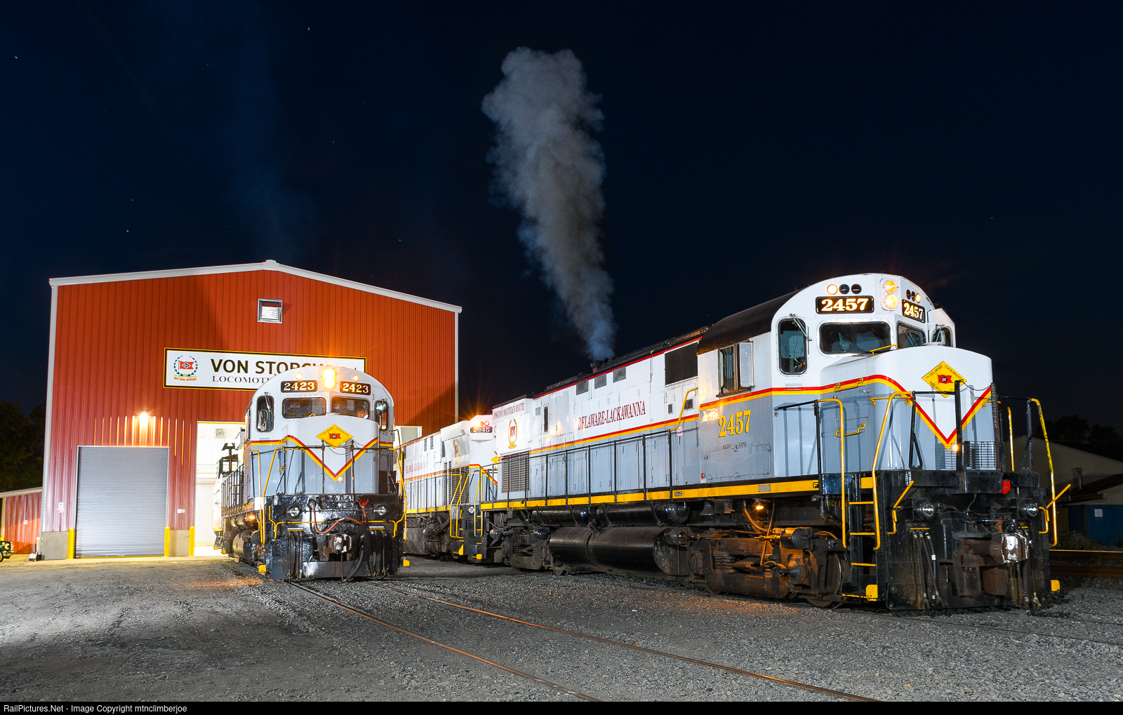 | Alco C425 2457 lets out a plume of smoke as the engineer fires it up for the night outside of the newly opened Delaware Lackawanna's Von Storch Locomotive Shop.