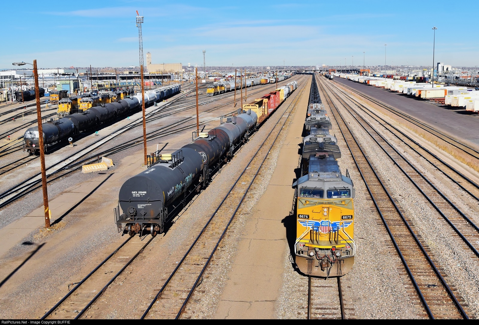 UP 6675 (AC4400CW) leads an oil can train through the North Yard in Denver, Colorado.