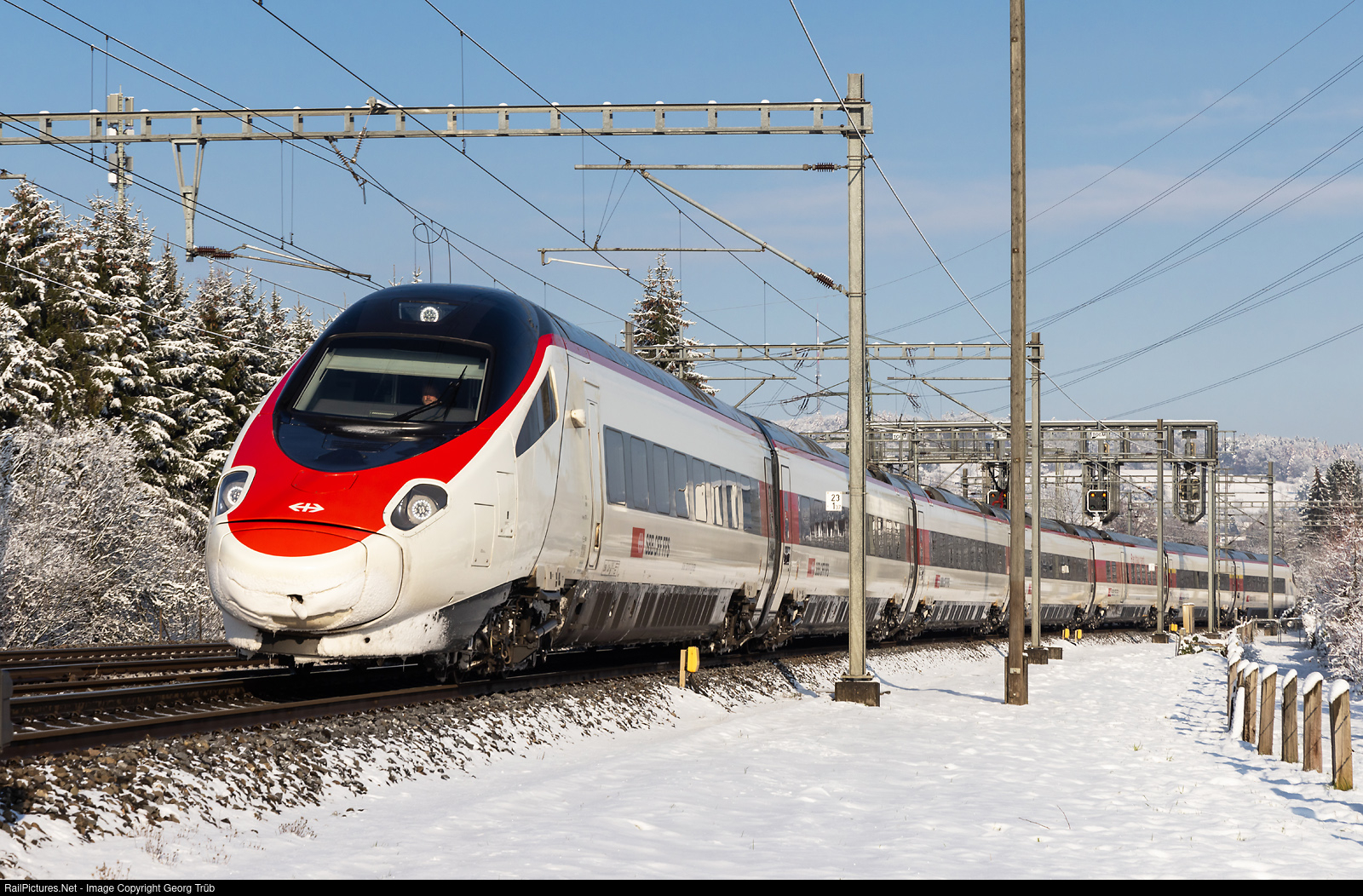 | Highspeed tilting train RABe 503 # 017 of the SBB is running the one hour late Eurocity 198 from Munich via Lindau-St.Margrethen-St.Gallen to Zürich, in Winterthur Tössmühle. |
