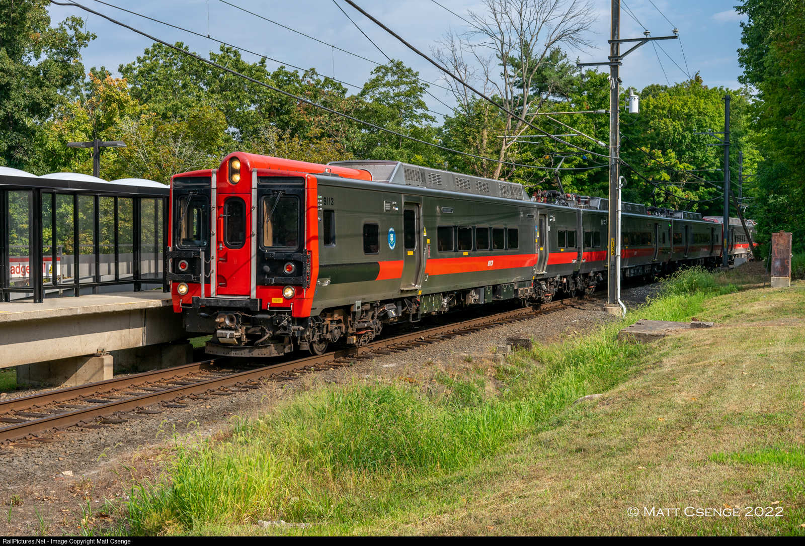M8 EMU 9113 (Kawasaki, 2011) is the lead motor on a New Canaan Branch train arriving at Talmadge Hill station. The branch diverges from the main New Haven Line east of Stamford, and has just four stations up to the terminus of New Canaan. Though the trains are newer and longer than the one- or two-car "Dink" shuttles that used to run here, service is still typically an hourly shuttle to and from Stamford; during peak hours trains provide direct service to and from Grand Central Terminal. |