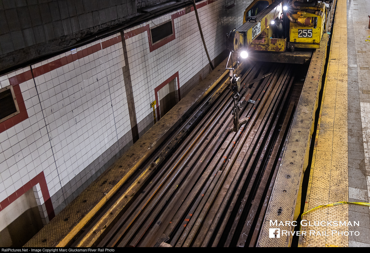 Underground Rail Train. While out to ride the Metropolitan Transportation Authority - MTA NYCT Subway/New York Transit Museum Holiday Train "Nostalgia Special" on Sunday, December 11, 2022, a visit to the Lexington Avenue Line was convenient to check out the rail replacement project around the Brooklyn Bridge/City Hall Loop. Due to this weekend work, these trains would be turning at Bowling Green instead, giving an opportunity to see these R-62As in a few stations that they do not normally visit. This "Contract One" section of the original Interborough Rapid Transit (IRT now A Division) is heavily utilized, and regular preventative maintenance with planned detours helps ensure that there will not be unplanned service disruptions. MTA NYCT Subway R-53 C255 (Fuji Heavy Industries, 1T Crane Car, 1979) carries a car load of stick rail to use during the rail replacement project.