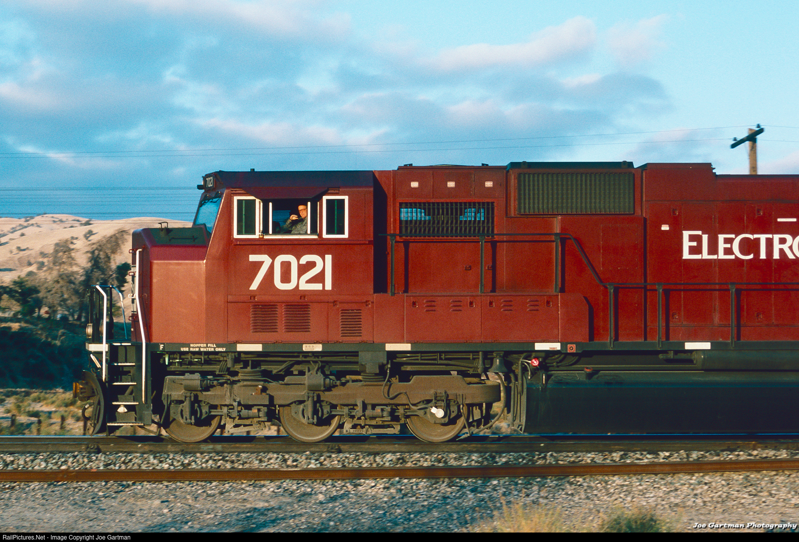 With a friendly wave from the Conductor, EMDX 7021 rolls through Caliente.