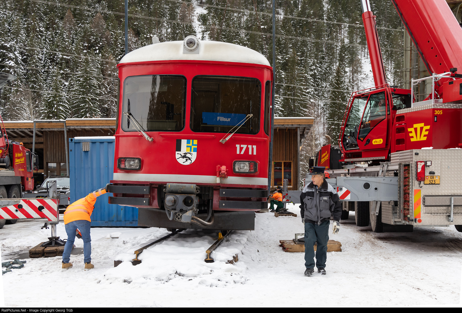 Cab car ABDt # 1711, built in 1971 by the FFA (Flug- und Fahrzeugwerke Altenrhein) for the Rhaetian Railway as part of the timeless elegant "Vorortspendel" (push-pull trains for regional traffic) with railcars Be 4/4, was withdrawn in 2022. Last service for two of this trains was for the BULA scout camp in the Goms in summer 2022 on the tracks of the Matterhorn-Gotthard-Bahn. Now two private persons bought this car and brought it to Filisur, whre it was placed on a piece of track in the Frevgias commercial zone. Emil Egger company was responsible for the transport from Landquart to Filisur and the crane work.