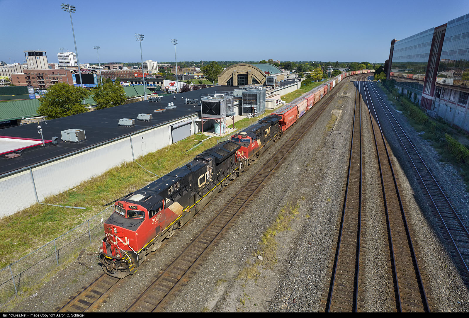 | A CN Grain Train passes by the old Packard Plant in South Bend, Indiana. Investors had started renovations to the plant including the shiny glass exterior but the project has since been stalled for some reason. In the Background on the left can be seen the old GTW Passenger station in South Bend. |