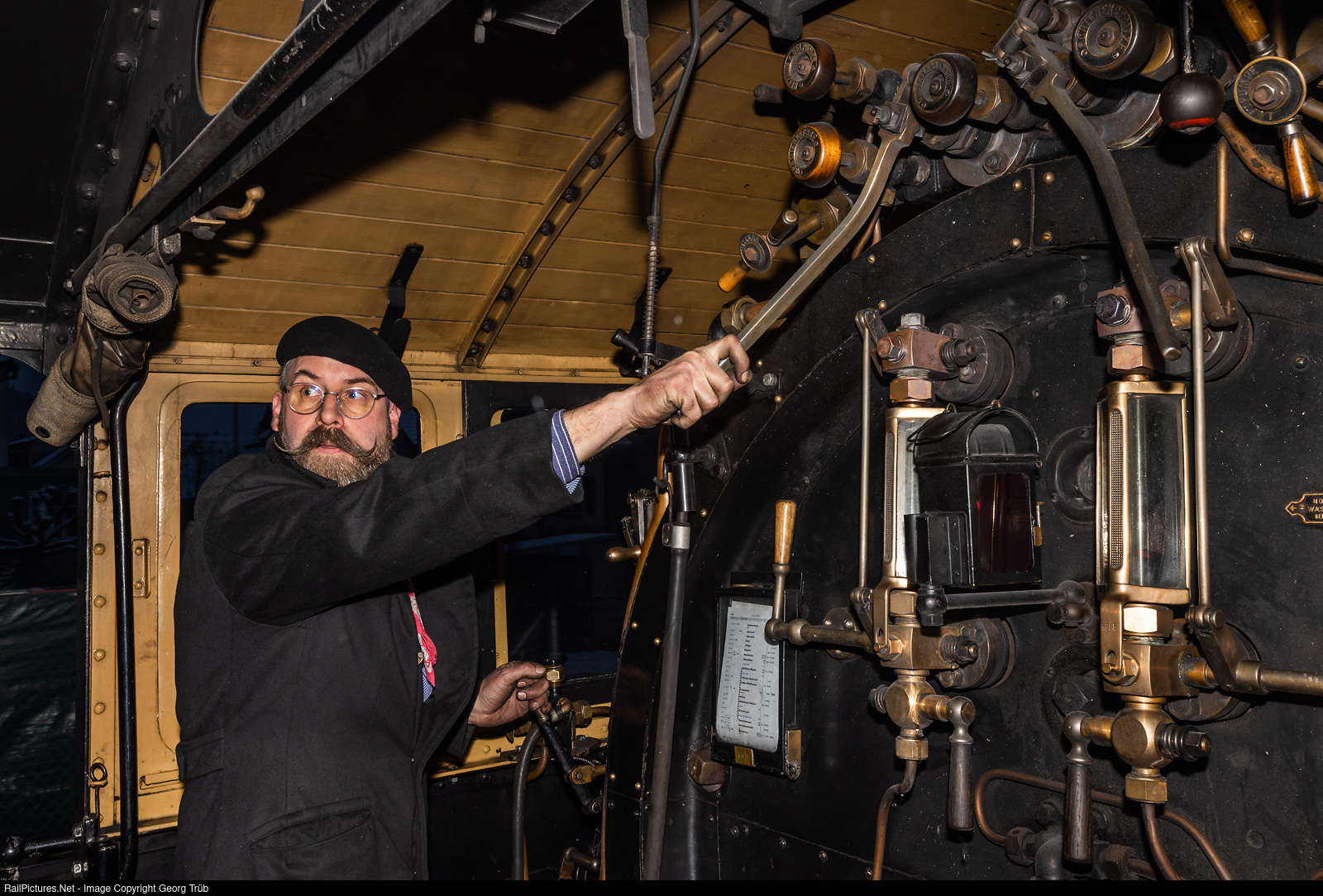 | Fireman Bruno U. on the 4-6-0 fourcylinder compound express train steamlocomotive A 3/5 # 705 of SBB Historic, built in 1904 by the SLM in Winterthur. The locomotive runs extremely smoothly at an instantaneous speed of around 90 km/h on the Thurtal mainline near Amriswil on the return trip from Romanshorn to Brugg AG, the maximum speed is 100 km/h. The association steam group Zürich (VDZ Verein Dampfgruppe Zürich) made a more then 3 years large overhaul and this was the final test and celebration run for the people which worked for and donators. |