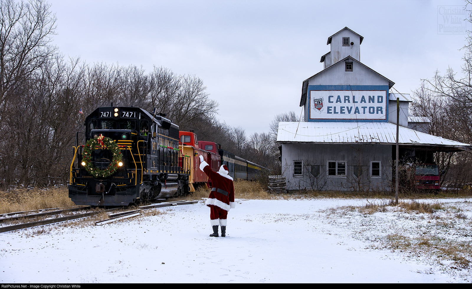 Western Maryland painted PNLX 7471 leads the Steam Railroad Institute's North Pole Express north past the elevator at Carland.