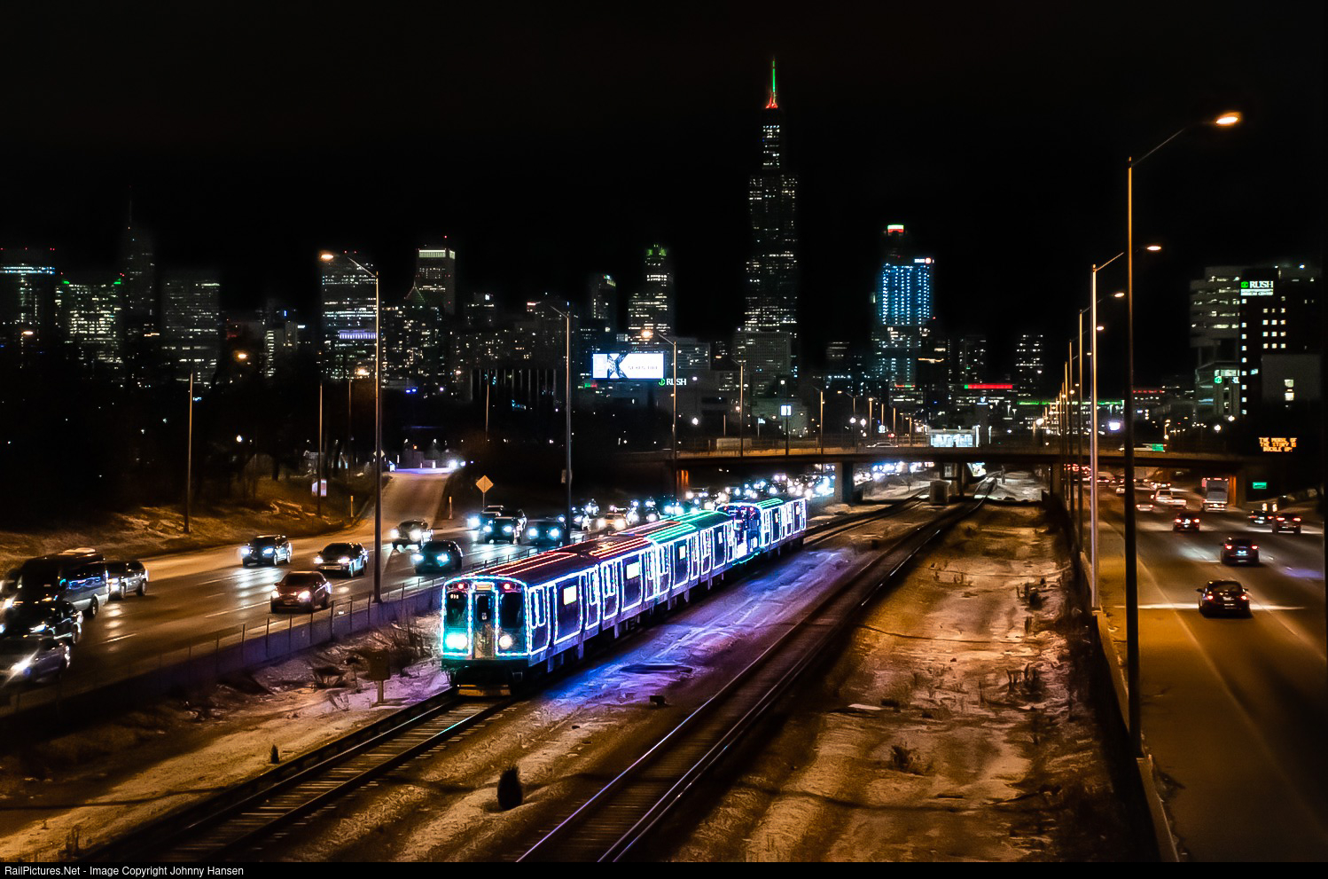 The 2022 Chicago Transit Authority Holiday Train splits the Eisenhower Expressway on the Blue Line, making a run out of Downtown before arriving at Forest Park.