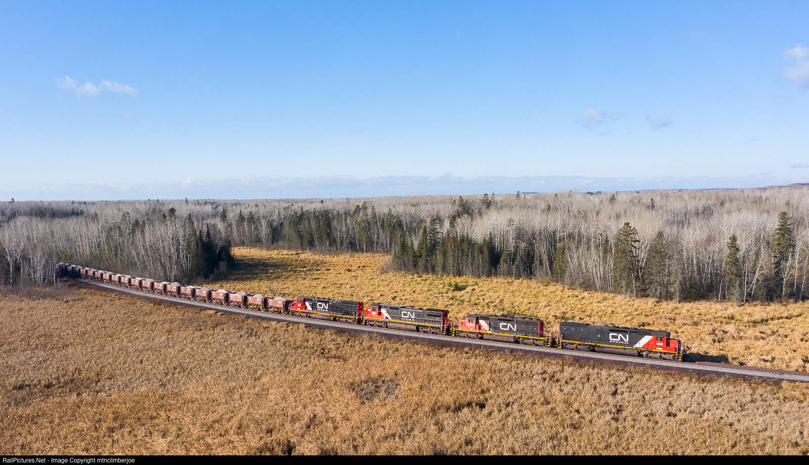| With stone loads in tow, CN U714 rolls through the swampland outside of Mountain Iron, Minnesota behind a pair of SD40T-3's bracketing an SD40-3 and a C40-8. The train is now on the Minntac Sub as it nears the end of its journey to US Steel's Minntac mine and taconite processing plant. |