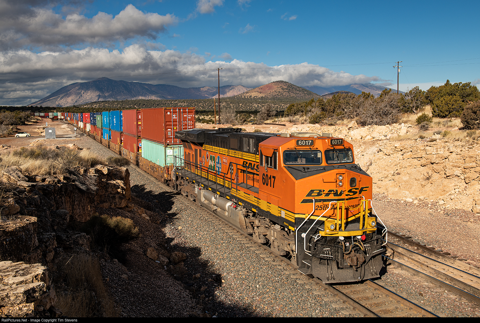 | Painted for BNSF's 25th Anniversary, BNSF ES44AC 6017 brings up the rear of a westbound stack train at Cosnino, AZ. |