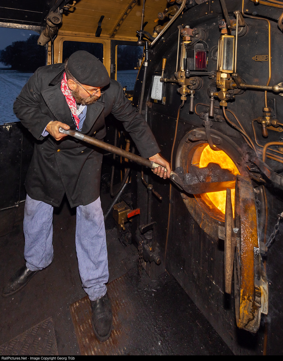 Fireman Bruno U. of the association steam group Zürich (VDZ) throws another shovel coal into the firebox of the 4-6-0 expresstrain steamlocomotive A 3/5 # 705 of SBB Historic on the trip from Romanshorn through the Thur valley to Winterthur-Brugg AG. The fourcylinder compound locomotive was built in 1904 by the SLM Winterthur for the SBB and is maintained and operated by the steam group Zürich nowadays.