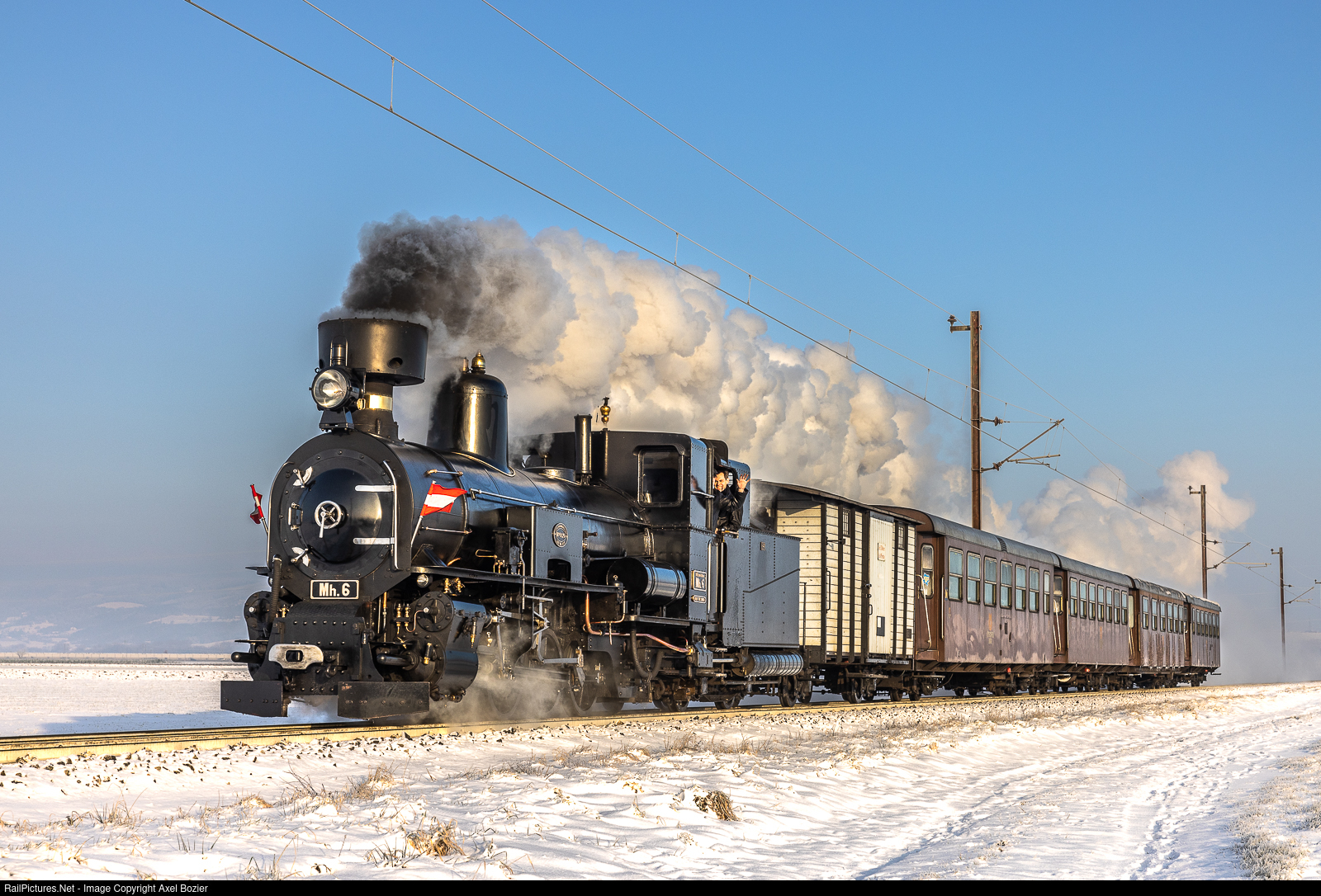 | Narrow-gauge 0-8-0 steam locomotive Mh.6 is pulling a special Christmas train from Sankt Pölten to Mariazell. This locomotive was built in 1908 by Krauss & Comp. in Linz, for the NÖLB (Niederösterreichischen Landesbahnen), Austria. The track gauge is 760 mm (2 ft 5 15/16 in). The line was already electrified between 1907 and 1911.