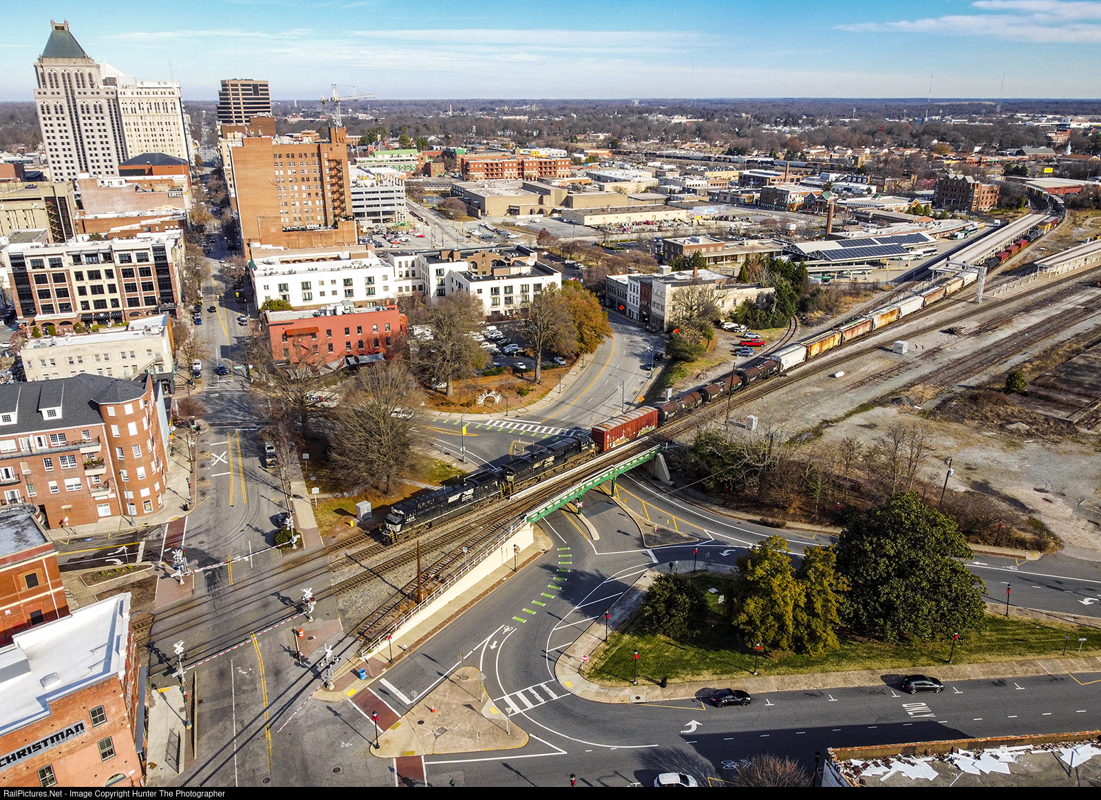 Southbound manifest train 13R rolls by the city block known as Hamburger Square in downtown Greensboro, NC on a sunny Monday, December 19, 2022 morning.