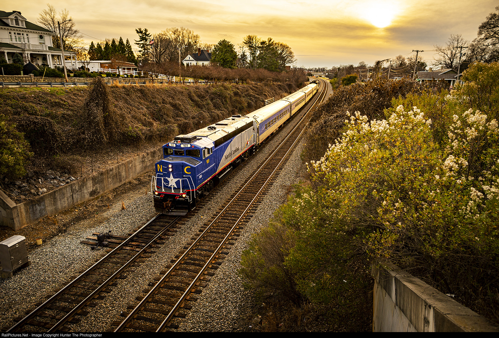 With the sun low in the sky on the evening of Monday, December 19, 2022, northbound Amtrak train 76 cruises into downtown High Point, NC.