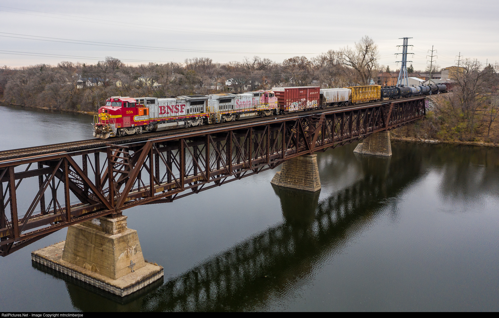 A pair of well worn GE B40-8W locomotives, still wearing their as-delivered warbonnet paint, are on the point of the BNSF L TWI8121 Local from Northtown to Saint Cloud as it comes off the Staples Sub and heads towards the yard to interchange with the Northern Lines Railway. The 1892 built 587 foot long four-span high deck pin-connected truss bridge carries the train over the Mississippi River and into downtown Saint Cloud, Minnesota.