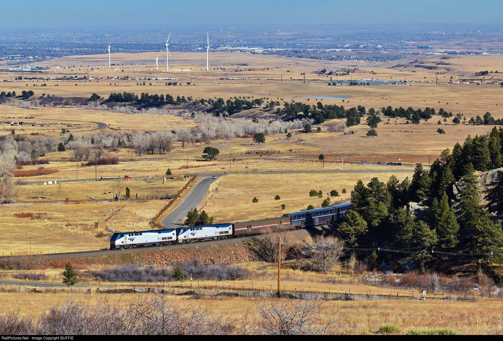 | The California Zephyr rounds the base of Blue Mountain and enters Coal Creek Canyon, Colorado. In the distance are the windmills being tested at Boulder's NCAR (National Center for Atmospheric Research) Mesa facility. |