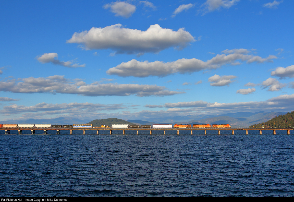 A westbound BNSF manifest freight makes its way across the long bridge over Lake Pend Oreille linking Sandpoint with Algoma, Idaho, on a perfect October 6, 2018. More recently, the new bridge in front of this one will making this view a bit more difficult (cluttered) now.