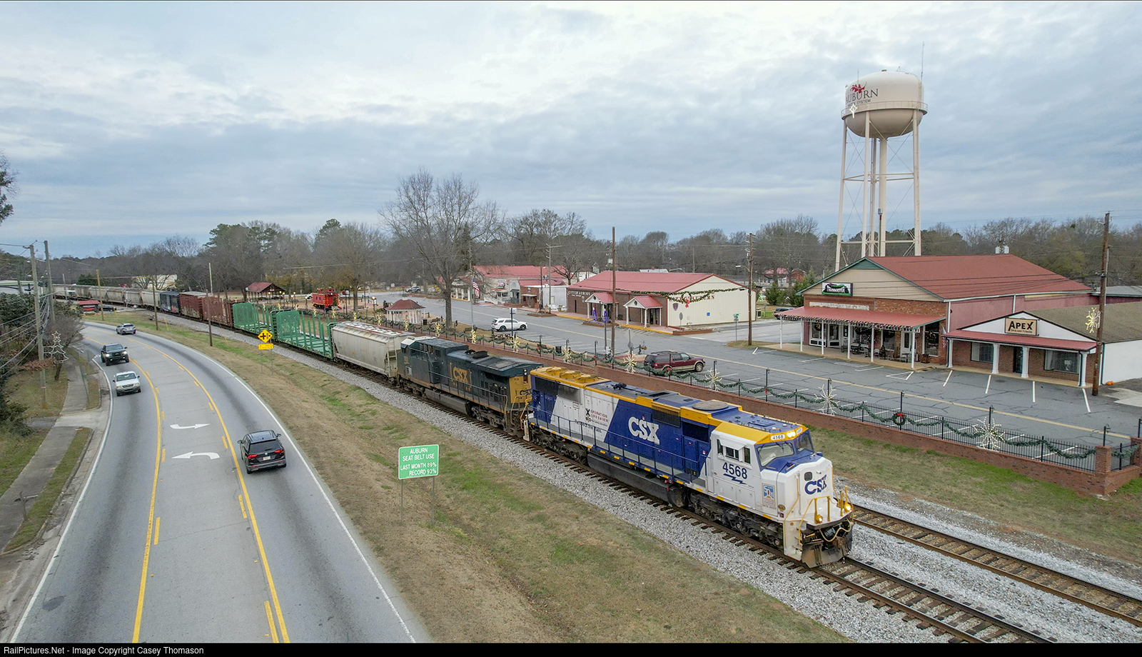 CSX train M58315 passes through downtown Auburn, GA, at 8:05am...three hours later, the doors of Trainmaster Models (the building above the nose of the lead loco), will be open for weekend model railroading business. Visit the store, or visit the website, for the best pricing and selection in the state of Georgia for all of your model railroad needs: www.trainmastermodels.com