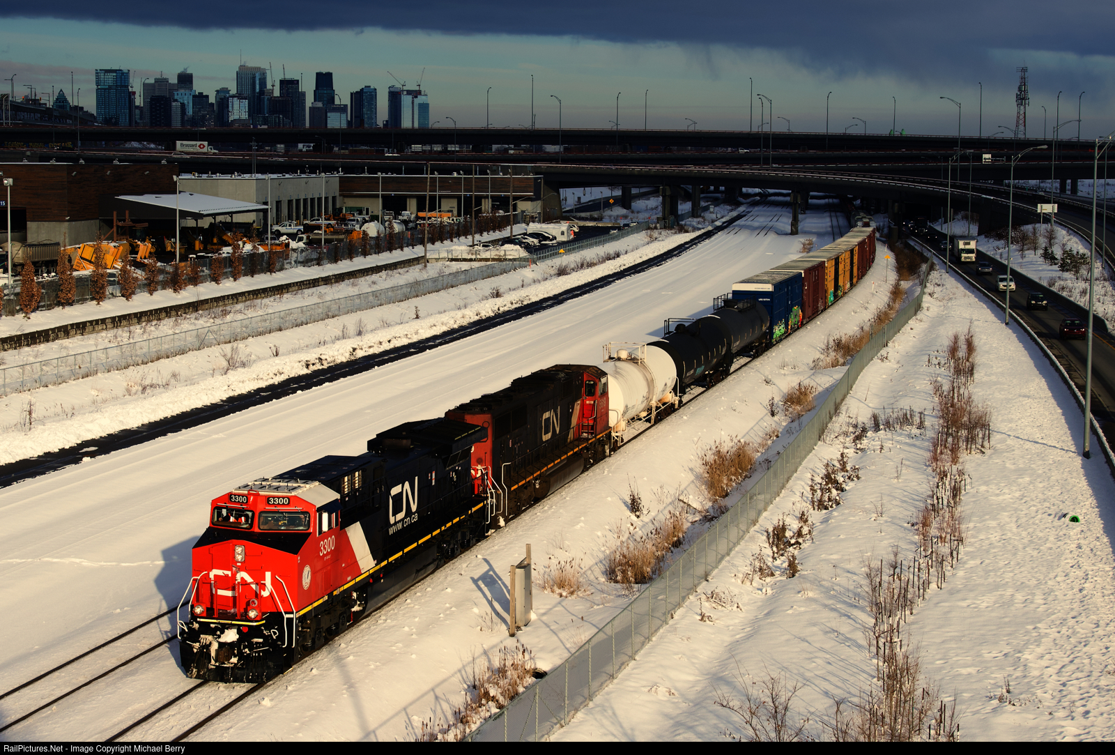 | The sun stays out just long enough to get a well-lit shot of CN 305 passing the skyline of downtwon Montreal with class leader CN 3300 leading. CN 3300 was rebuilt from Dash9 CN 2641 and has been in service a bit under two months now. |