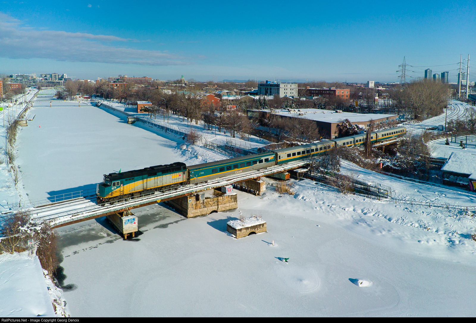 VIA's F40PH no. 6419 leads a short 4-car LRC consist as train no. 67 over Montreal's frozen Lachine Canal with final destination Toronto.