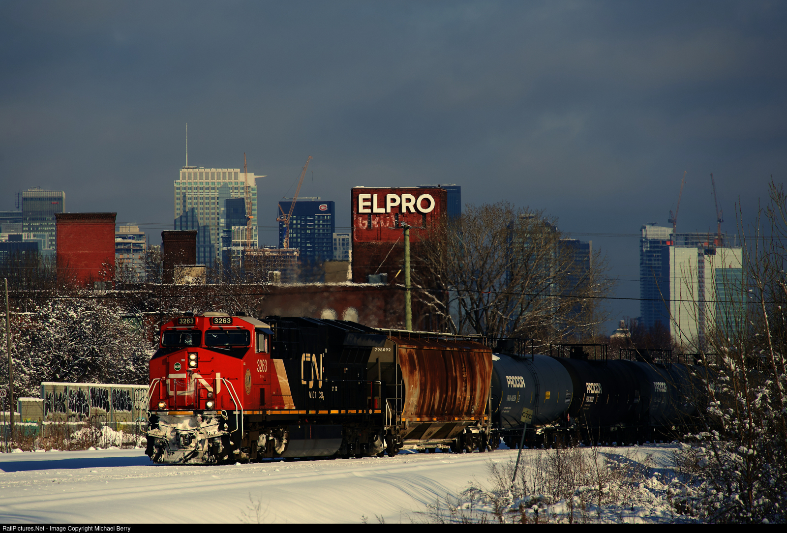 CN 3263 leads CN 305 as it passes the skyline of downtown Montreal.