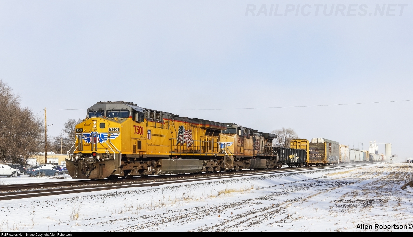 UP 7301 & 5565 lead a westbound manifest on a bitterly cold day, temperature -6 (windchill -34).