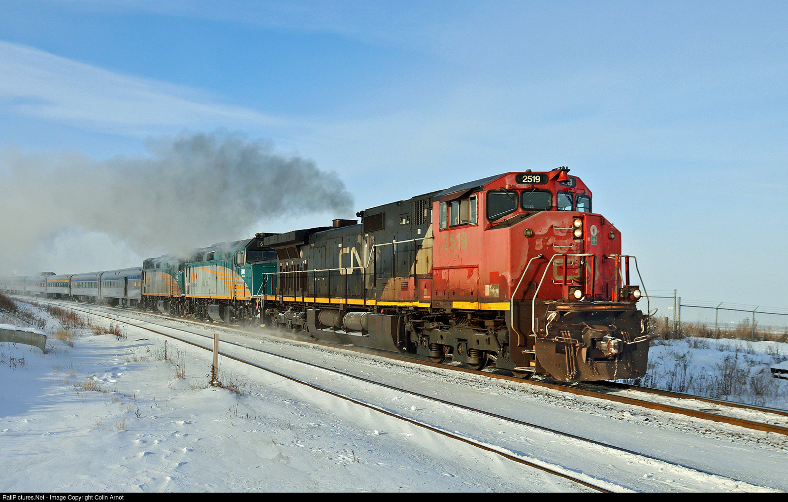 | A very late running ( 15/16 hours) VIA #2 is heading east on the Wainwright Sub away from Edmonton with the assistance of CN 2519. Reportedly one of the HEP units on the VIA locomotives had failed. The joys of winter operations, at the time of this shot -30C on thermometer, -40C windchill. |