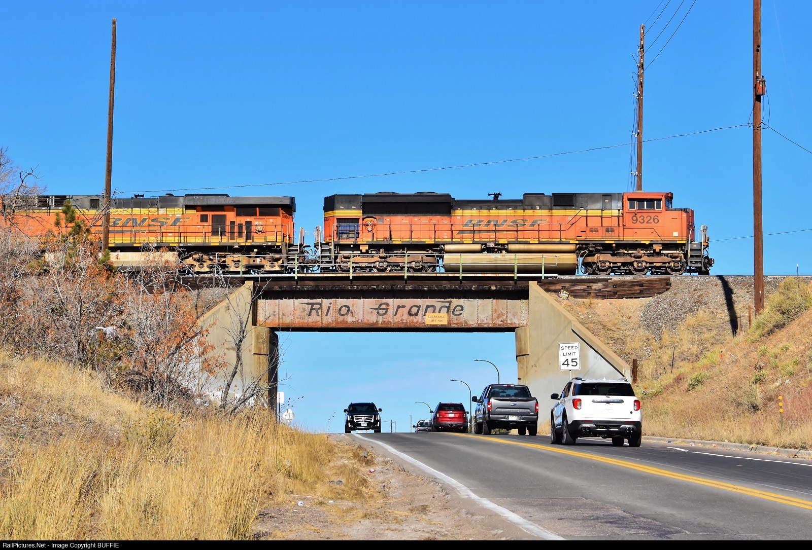 | BNSF 9326 (SD70ACe) leads a freight over a Rio Grande bridge as it heads towards Leyden, Colorado. This bridge is destined to be removed soon as the county will be widening the road to 4 lanes.