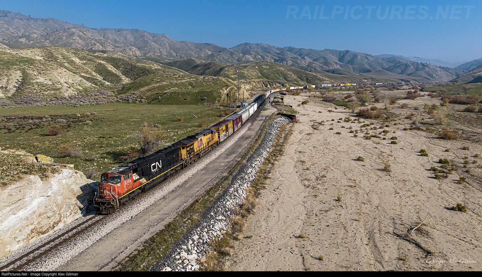 | CN 5745 looks out of place in Central/Southern California as it shoves hard on the rear of a Union Pacific, West Colton-bound manifest that has just begun to tackle the grades of Tehachapi as it leaves Illmon behind and prepares to enter "The Narrows." |