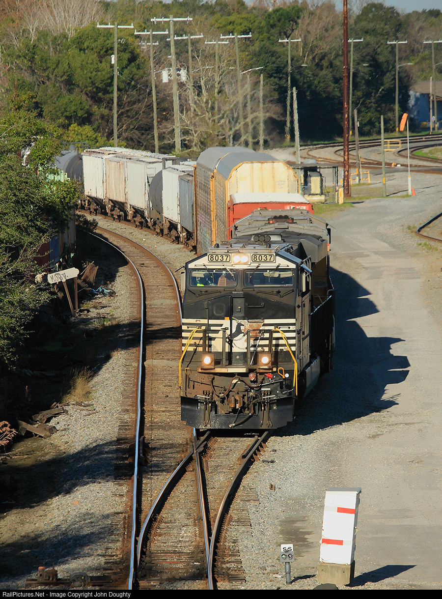 | NS 8037 has gotten a green signal and is about to go through a switch that isn't aligned for it, as it heads towards the Florida East Coast Railroad's Bowden yard in Jacksonville. To the right is the CSX Moncrief yard. |