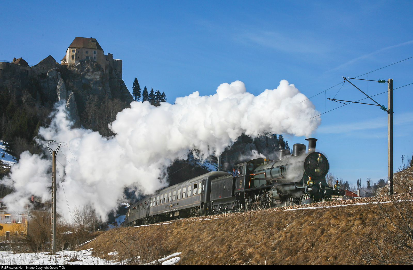 | The 4-6-0 fourcylinder compound expresstrain steamlocomotive A 3/5 # 705 of SBB Historic is pulling a charter train of the IGE during the 3 days "Winterdampf im Jura" program from Pontarlier/France to Les Verrières/Switzerland at Le Frambourg, with the Joux castel (Château de Joux) from the 11th century up on the hill. |