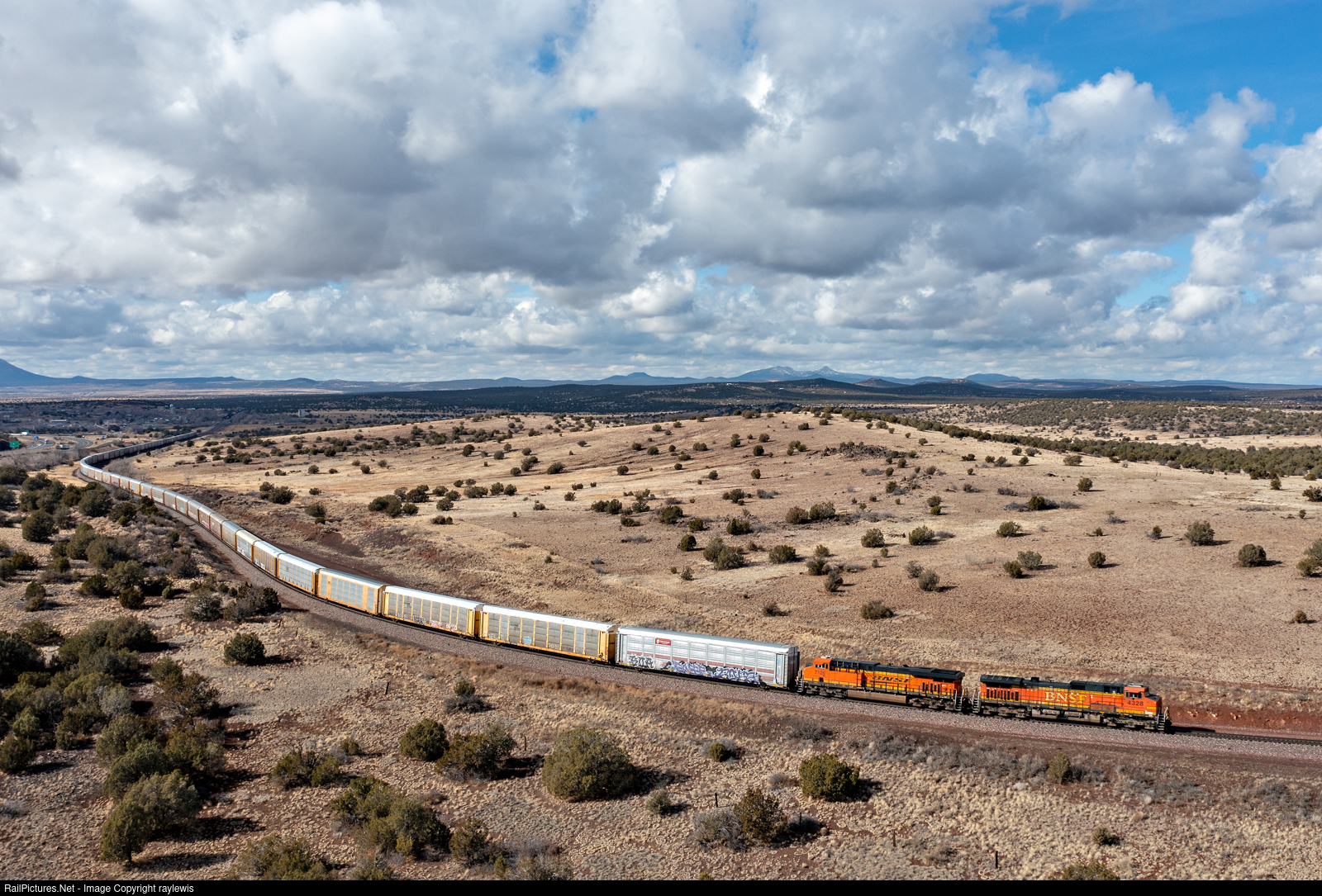 | After a crew change at Ash Fork, the eastbound vehicle train is on the move again making its run at the grades up the final miles on the Phoenix Subdivision before entering the BSNF transcon at Williams, AZ. |