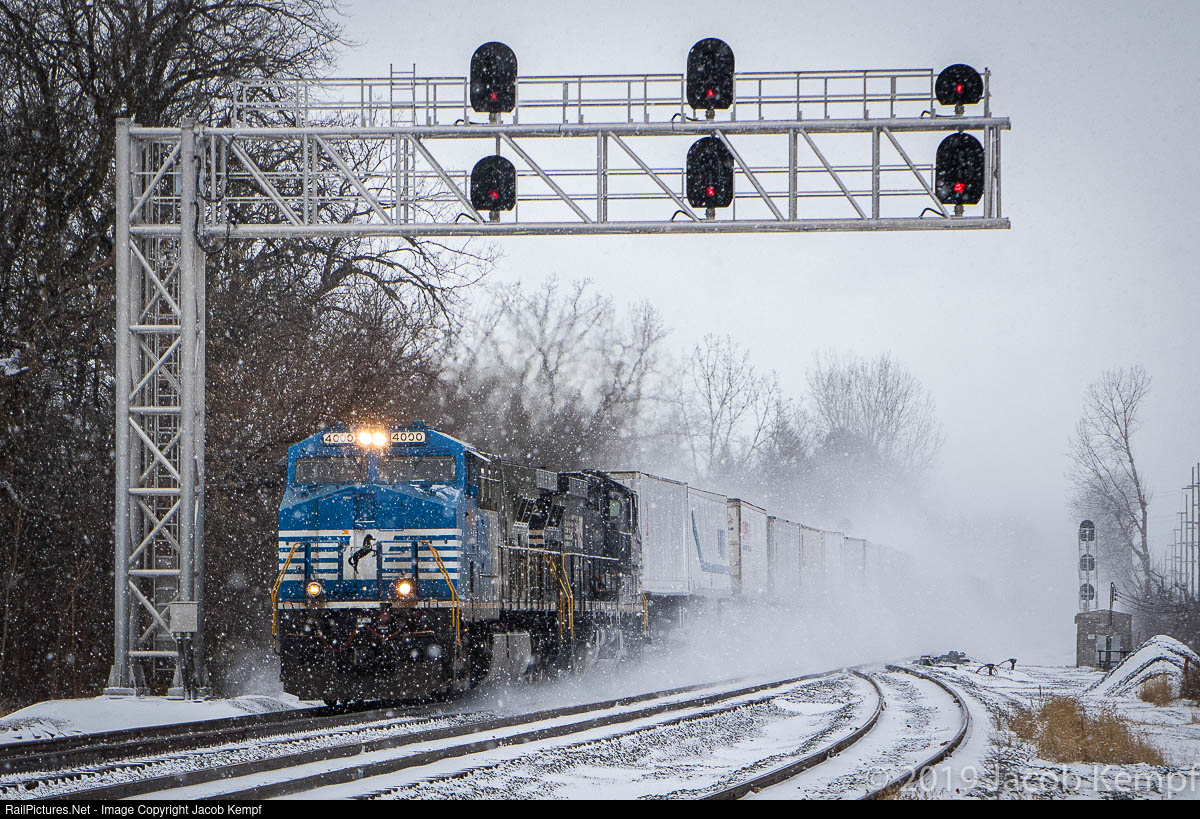| NS 4000 gallops through CP 307 in Swanton during a moderate snowfall on New Years Eve a few years ago with train 20E. This was the location where, about six months prior to this photo, a westbound stack train struck an unoccupied vehicle, derailed and knocked over some power lines. |