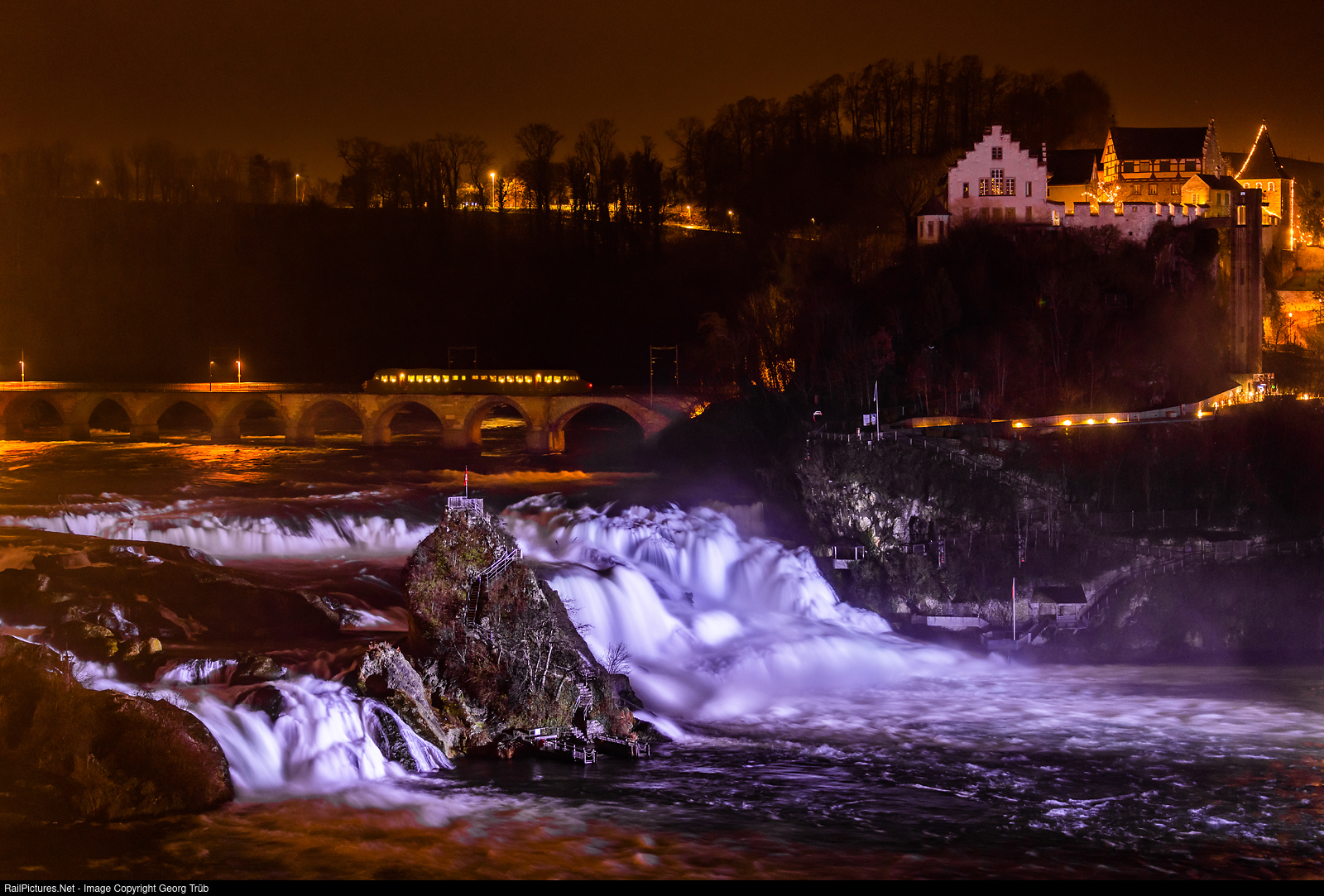 On Christmas Eve, RAe 4/8 # 1021 "Churchill-Arrow" made the traditional evening trip with fine food and drink. The trip led from Zurich via Wallisellen-Winterthur-Andelfingen-Rheinfallbrücke-Schaffhausen to Etzwilen, and back via Ossingen-Winterthur-Wallisellen to Zurich again. On the bridge over the Rhine from 1856, above the Rhine fall, the "Churchill-Pfeil" made a stop for some minutes. This year, the illumination of the Rhine fall, the bridge and of the Churchill-Pfeil as well was very much minimized in order not to waste electric power unnecessarily. On the right is the Laufen castle.