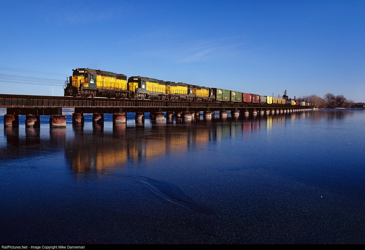 A Fox River Valley Railroad freight crosses the long bridge over thin ice atop Little Lake Butte des Morts at Menasha, Wisconsin, on a cold November 18, 1989. All three of FRVR’s EMD GP30s—Nos. 814, 815 and 820—along with GP35 No. 831, obviously all former Chicago & North Western locomotives, power the northbound train. Unfortunately, unless you want to walk or cycle across this bridge, this part of the C&NW line to Green Bay is abandoned onto the bridge and north, now called the “Friendship Trail.”