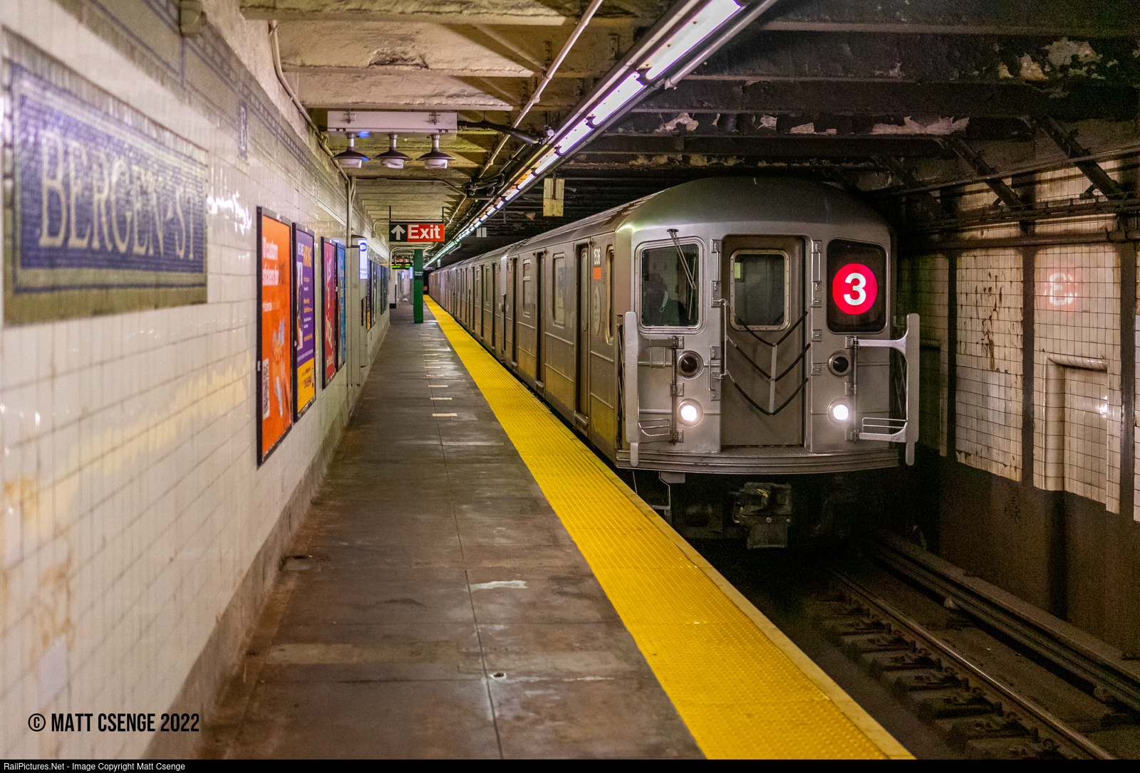 Bergen St. A New Lots Ave-bound 3 train of R62 cars (Kawasaki, 1983-1985) is seen arriving at Bergen St Station on the IRT Eastern Parkway Line.