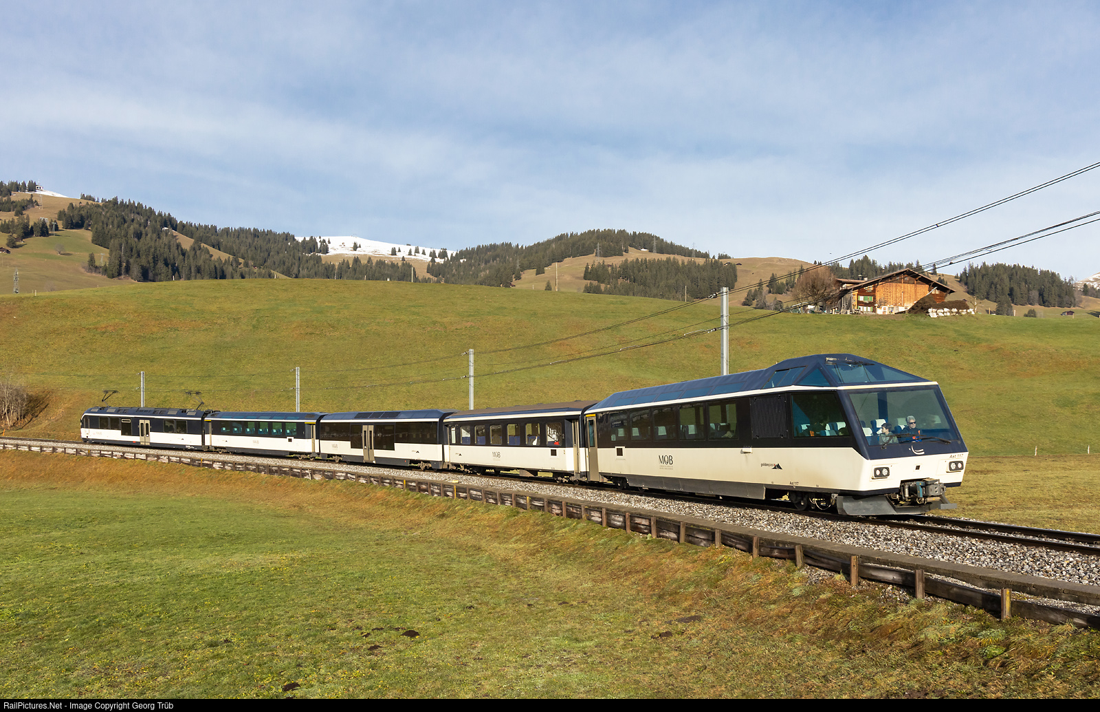 | Push-pull GOLDENPASS PANORAMIC train PE 2212 of the Montreux-Oberland-Bernois (MOB) from Montreux to Zweisimmen, between Gruben and Schönried (photo from the rear). Pulling is ALPINA railcar Be 4/4 # 9203 (StadlerRail), followed by first class As # 112, partly lowfloor second class Bs # 237, second class B # 218 and first class cab car Ast # 117 in the rear. |