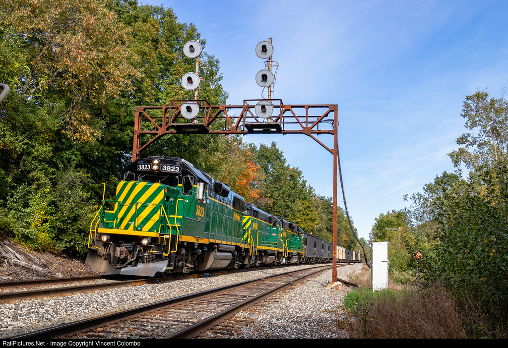 New Hampshire Northcoast train D8 is seen swinging onto CSX territory at CPF 241 in Rollinsford, NH. The train of sand is being brought from Ossipee, NH to Dover, NH and eventually Boston, MA. GP18 1801 was added to the train while less-desirable FURX 5509 was down for maintenance.