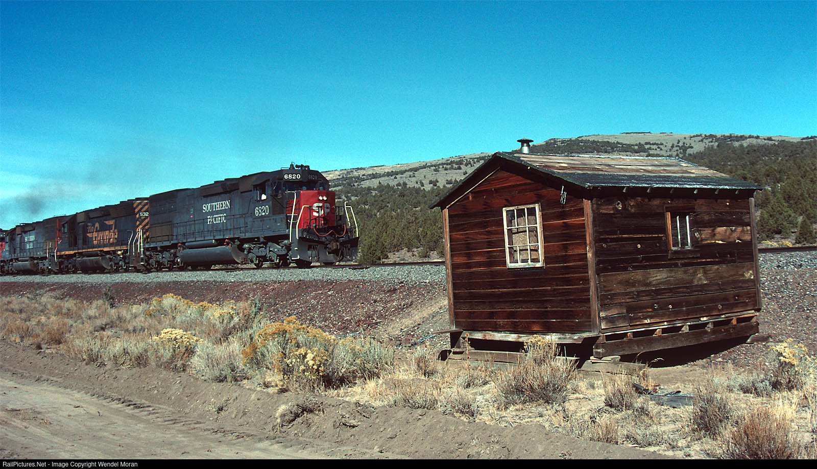 This odd structure once stood at Sage Hen on the Modoc Line. Not long after Rio Grande Industries acquired Southern Pacific in fall 1988, an eastbound passes the shack.