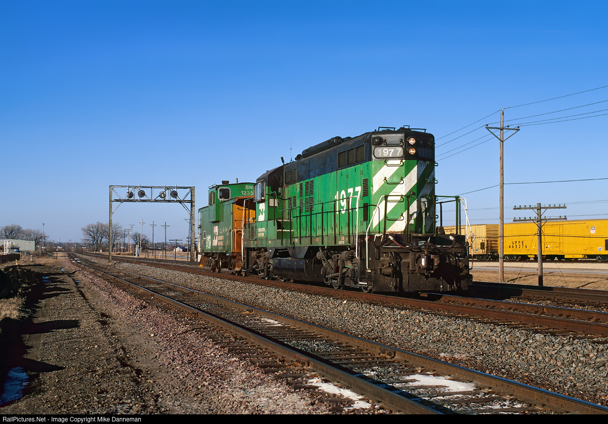 On the afternoon of December 28, 1995, a Burlington Northern local freight, arrives at Rochelle, Illinois. The “caboose hop” is powered by BN GP9 No. 1977, a former Spokane, Portland & Seattle locomotive built by EMD in June of 1956, and is set up to operate long hood forward.