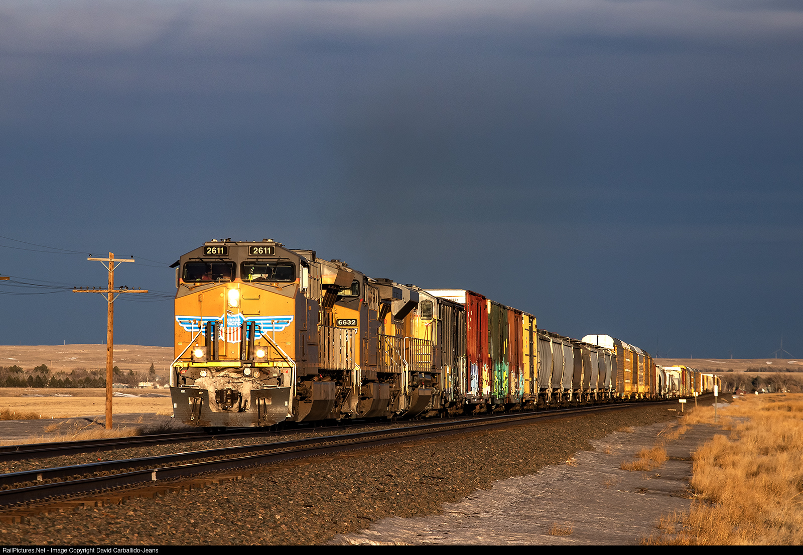 | A Tier IV GE motor leads the North Platte, NE to Portland, OR manifest as the last rays of sunlight were able to peak through the clouds. This train was leading the small fleet of westbounds trains that were holding up eastbound traffic at Kimball. That was due to other westbound trains being tied down on the mainline. |