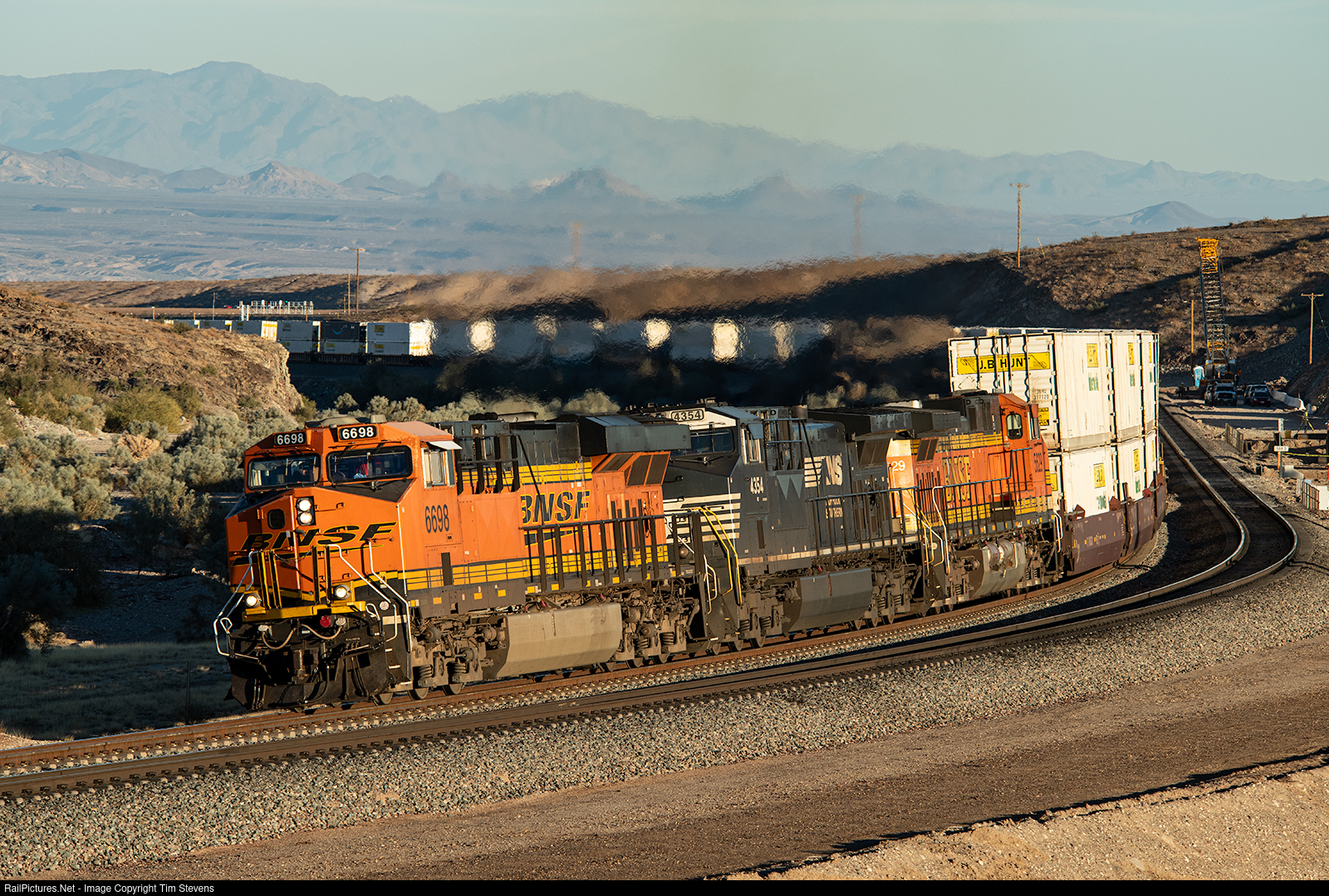 BNSF ES44C4 6698, NS AC44C6M 4354 and BNSF AC4400CW 5629 head west for LA with a Q train.