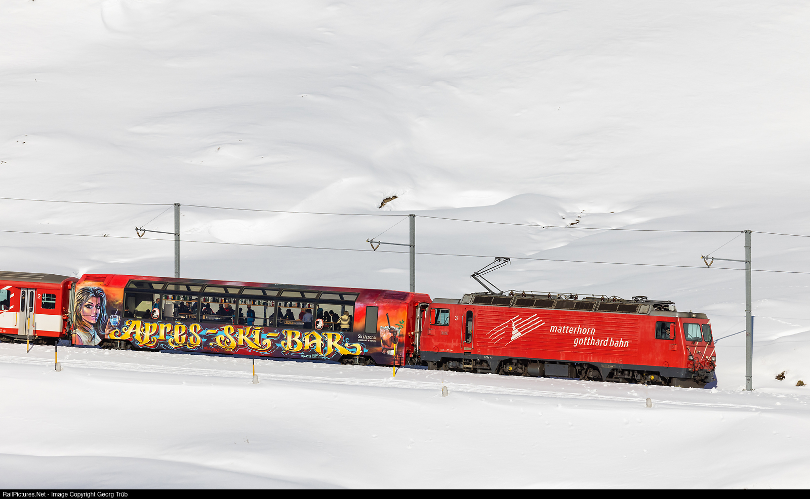 Since 2017/2018, with an interruption during the Corona pandemic, après-ski cars have been running on the Oberalp Pass railroad line of the Matterhorn-Gotthard Railway between Andermatt and Disentis on certain regional trains. Here, regional train R 836, hauled by HGe 4/4 II # 3 "DOM", former Brig-Visp-Zermatt Railway (BVZ), is en route between the Oberalp Pass and Tschamut-Selva with bar car Bp # 4028. The car had been built by Breda and SIG in 1993 for the Furka-Oberalp-Bahn (FO) as a second class panorama car for the Glacier Express trains and was converted into a bar car in 2017 on the initiative of Egyptian investor Samih Sawiris to promote the new Andermatt-Sedrun ski area. The exterior design was done by Patrick Wehrli and Alex Hohl with the spray can. Second rebuilt bar car in blue is Bp # 4027.