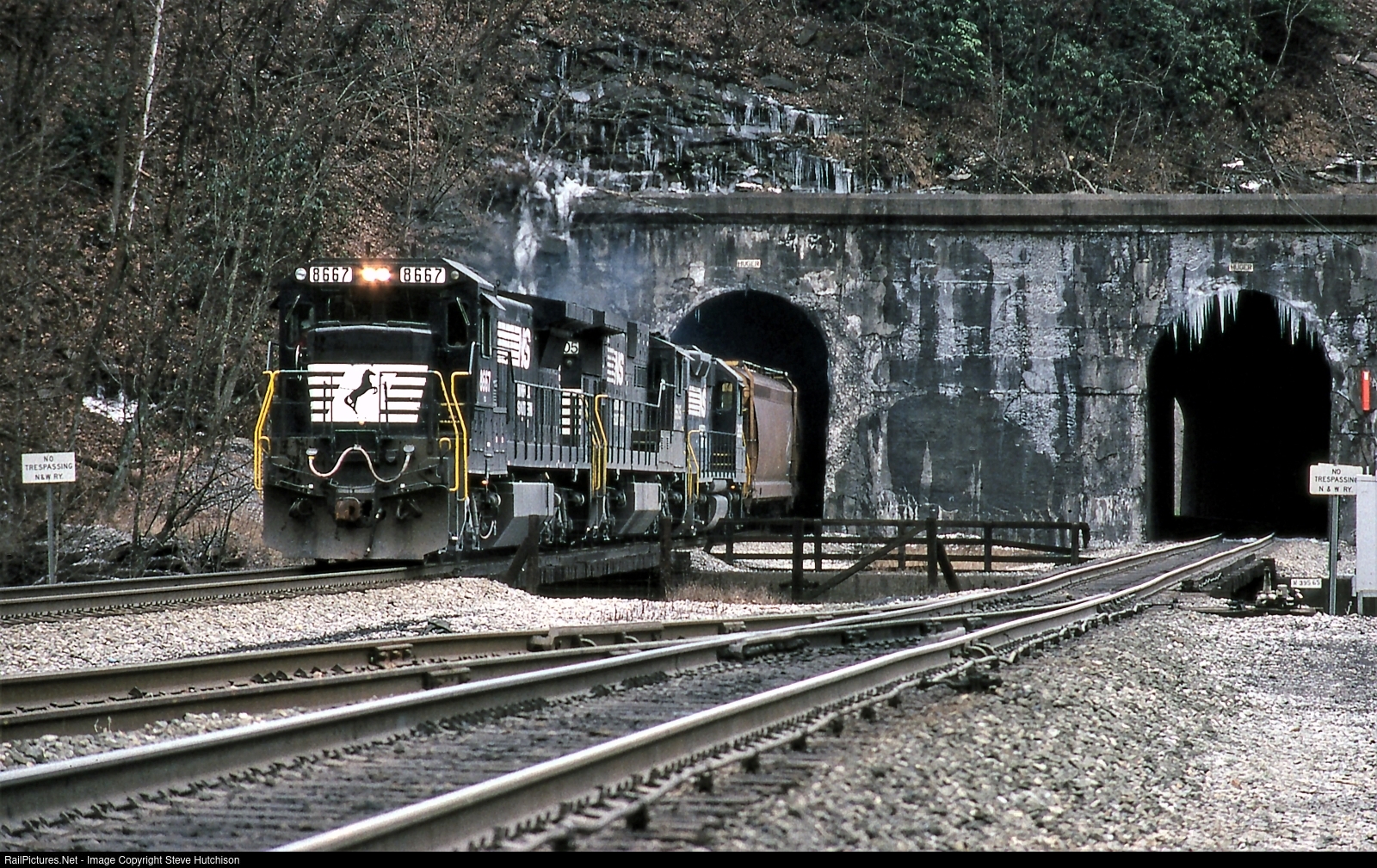 NS 8667 leads a westbound empty grain train out of the Huger Twin Tunnels on a cold March day in West Virginia.