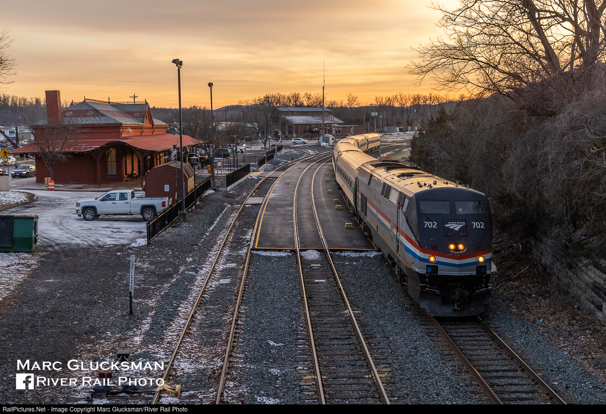 Central Hudson. Amtrak Train 291 (Ethan Allen) was a sunset arrival into Hudson, New York on Wednesday, December 28, 2022 with AMTK 702 leading (P32AC-DM, Phase III, GE). The vintage New York Central Station is still used by passengers today, the former engine house in the background on the wye of CSX's Claverack Industrial Track is today an event venue. The City of Hudson is undergoing a significant renovation, including the recent upgrades in the tracks and platform at this station, while making sure that it respects the history of this long time industrial center.