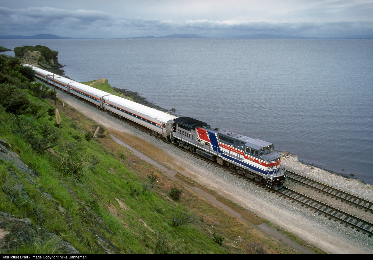 An eastbound Amtrak Capitol rolls along San Pablo Bay at Pinole, California, on March 12, 1995. The train is led by GE P32BWH “Pepsi Can” No. 501, that was later sold and became California Department of Transportation (CDTX) No. 2051.